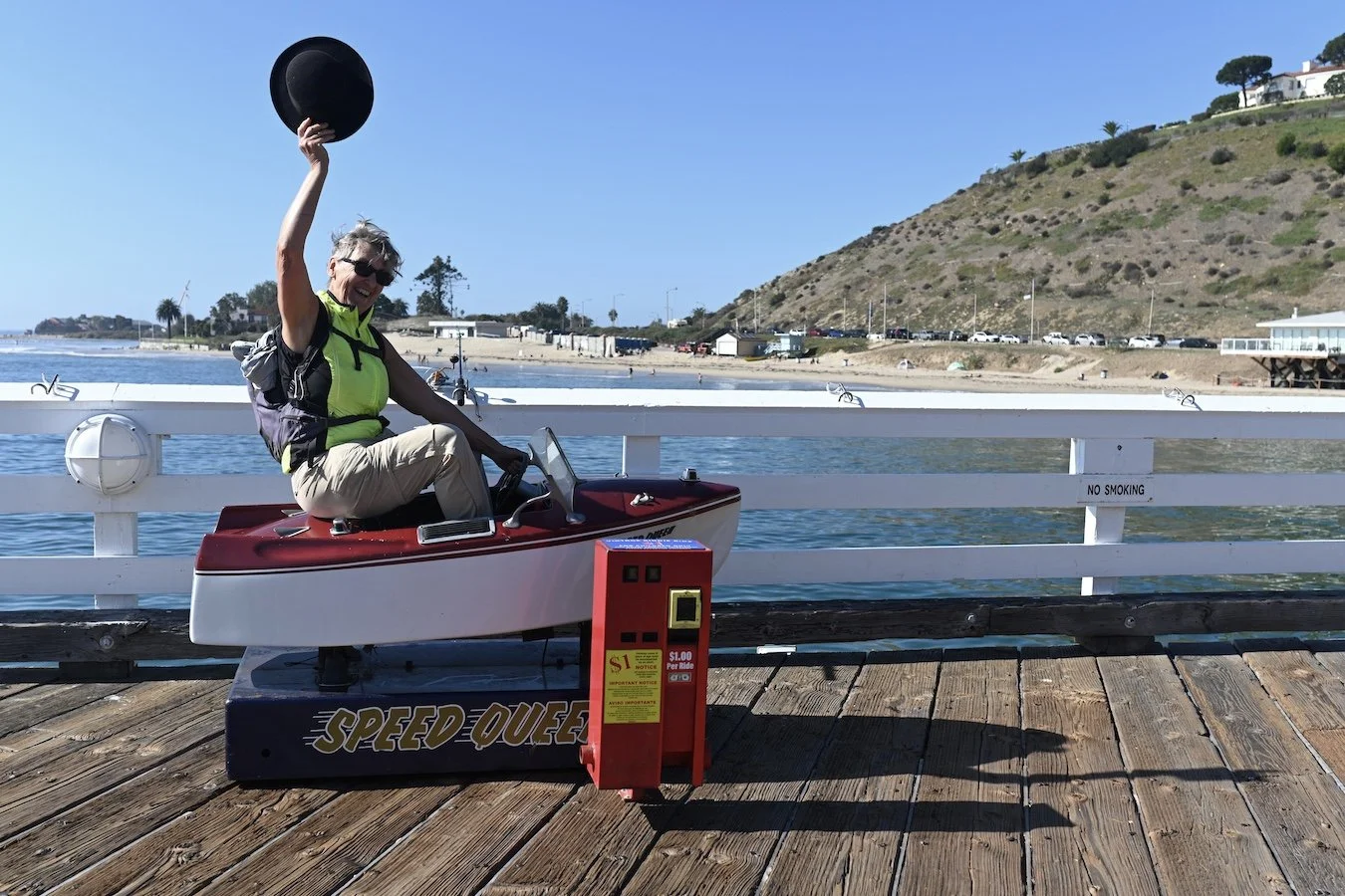 Jo riding rodeo at the pier. She inspired another woman to take a ride and even loaned her the hat for a photo opportunity.